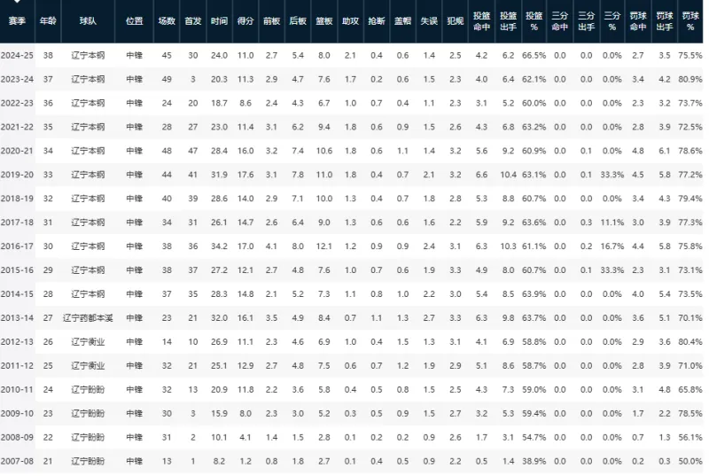 对比辽篮不同时期的代表性内线:2000 年代的 “铁塔” 王守强,以强硬防守与篮板拼抢著称,但生涯场均仅 7.2 分 5.1 篮板,且未经历辽篮夺冠周期;2010 年代初期的李晓旭虽以 “篮板怪兽” 闻名,但主打大前锋,且进攻端戏份远不及韩德君;即便是曾与韩德君搭档的内线球员,也无人能在生涯长度与数据全面性上与之匹敌。