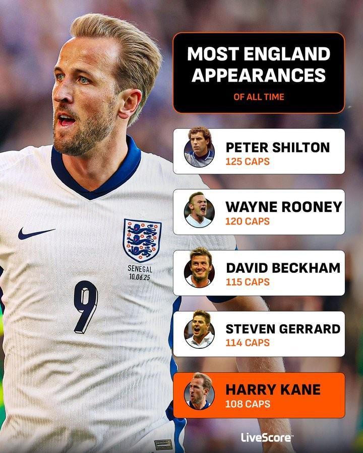 统计表明,这是凯恩生涯第108次为英格兰出场,现在他已经成为英格兰队史出场第五多的球员,仅次杰拉德(114)、贝克汉姆(115)、鲁尼(120)和希尔顿(125)。